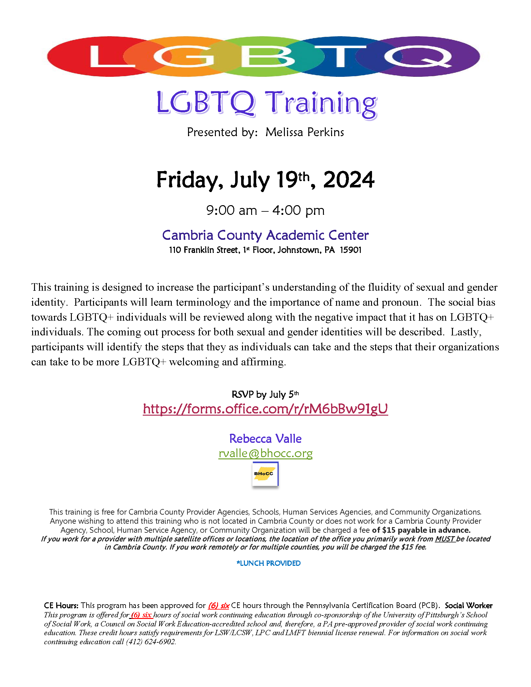 This training is free for Cambria County Provider Agencies, Schools, Human Services Agencies, and Community Organizations. Anyone wishing to attend this training who is not located in Cambria County or does not work for a Cambria County Provider Agency, School, Human Service Agency, or Community Organization will be charged a fee of $15 payable in advance.