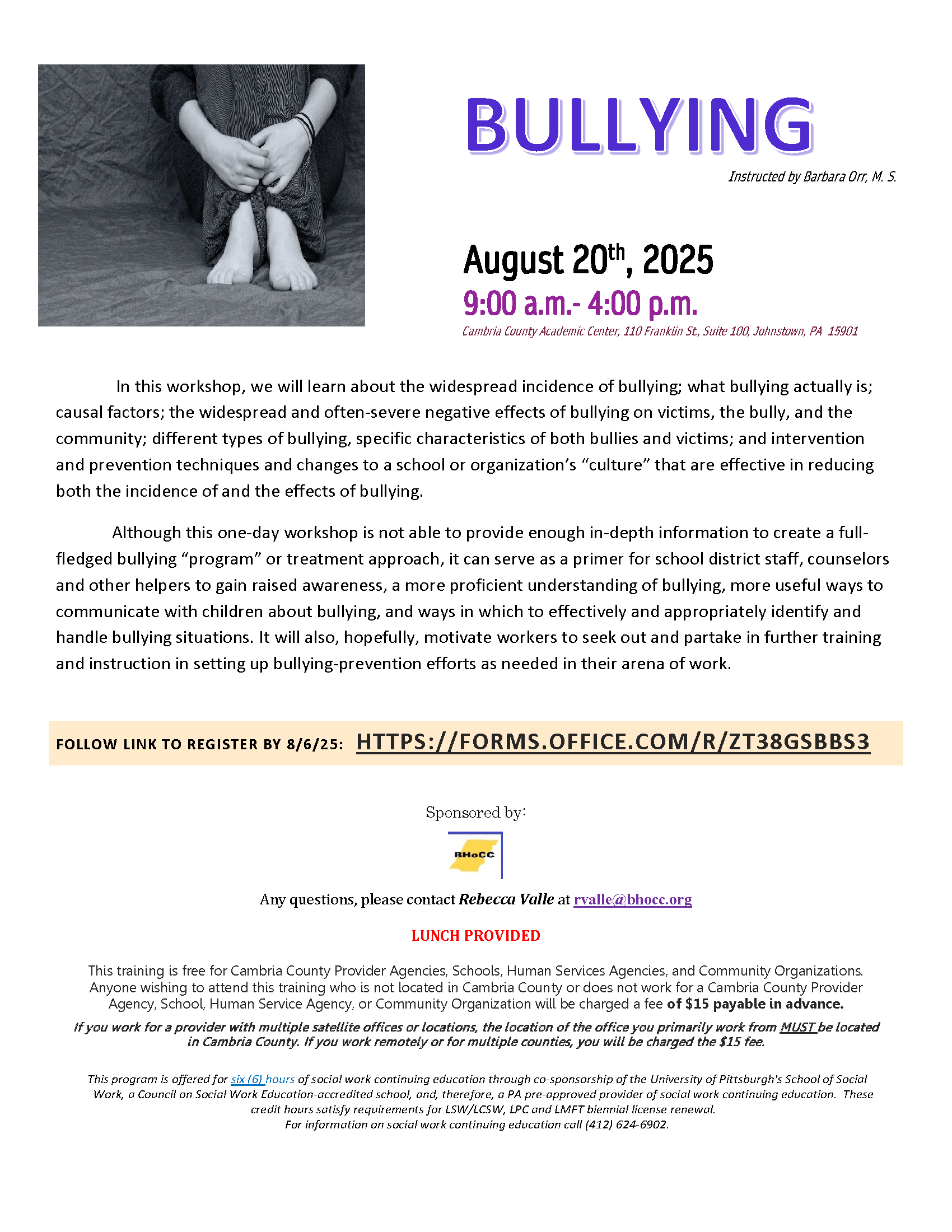 This training is free for Cambria County Provider Agencies, Schools, Human Services Agencies, and Community Organizations. Anyone wishing to attend this training who is not located in Cambria County or does not work for a Cambria County Provider Agency, School, Human Service Agency, or Community Organization will be charged a fee of $15 payable in advance.