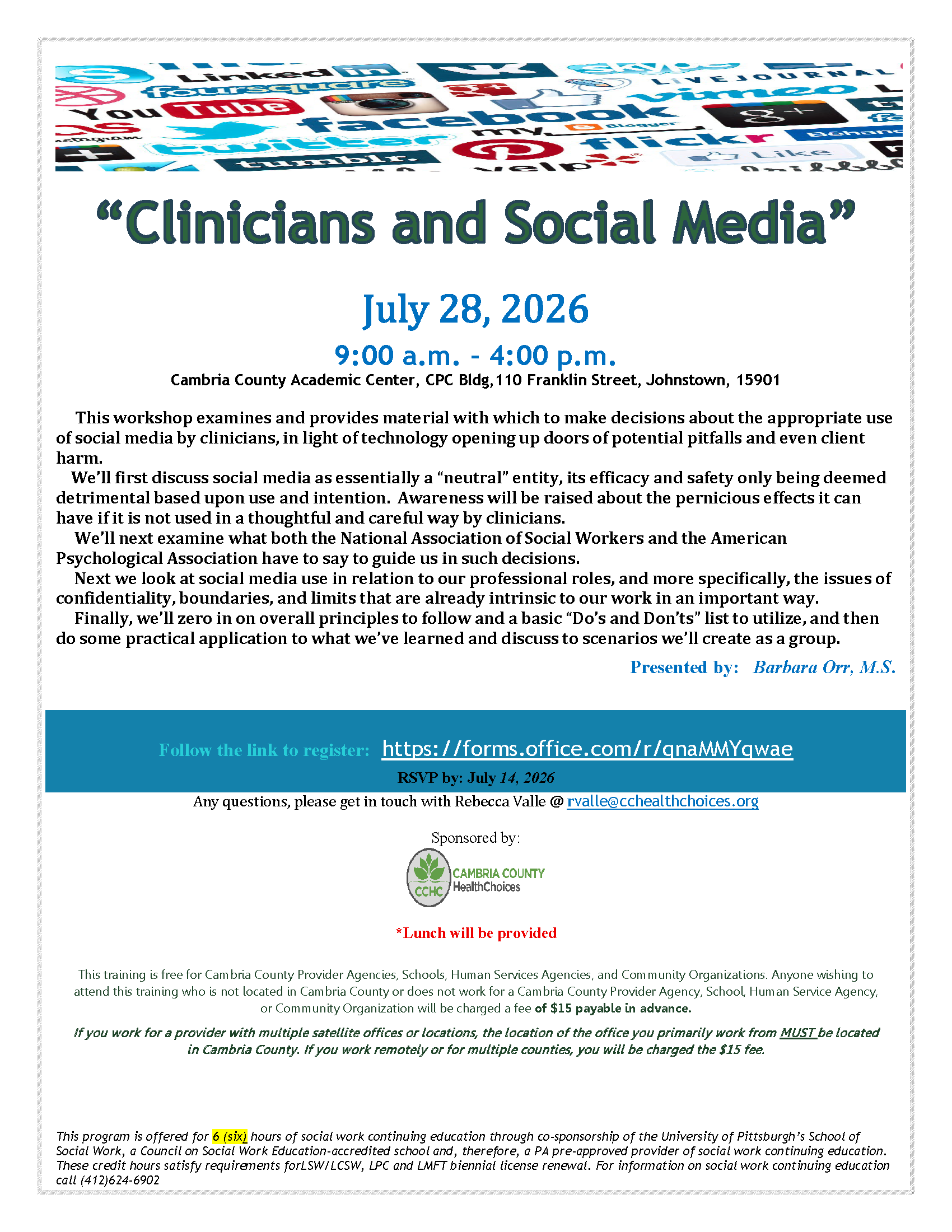 This training is free for Cambria County Provider Agencies, Schools, Human Services Agencies, and Community Organizations. Anyone wishing to attend this training who is not located in Cambria County or does not work for a Cambria County Provider Agency, School, Human Service Agency, or Community Organization will be charged a fee of $15 payable in advance.