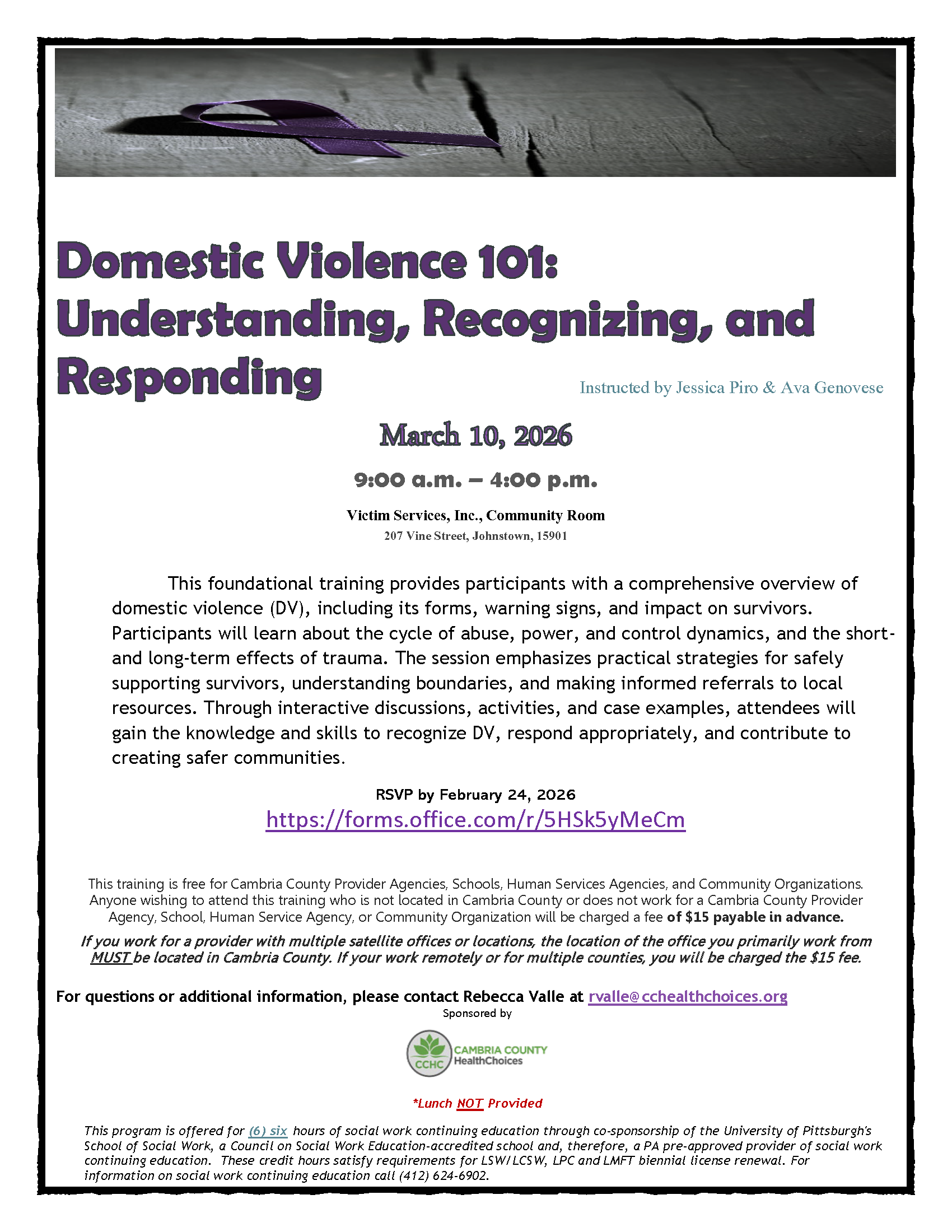 This training is free for Cambria County Provider Agencies, Schools, Human Services Agencies, and Community Organizations. Anyone wishing to attend this training who is not located in Cambria County or does not work for a Cambria County Provider Agency, School, Human Service Agency, or Community Organization will be charged a fee of $15 payable in advance.
