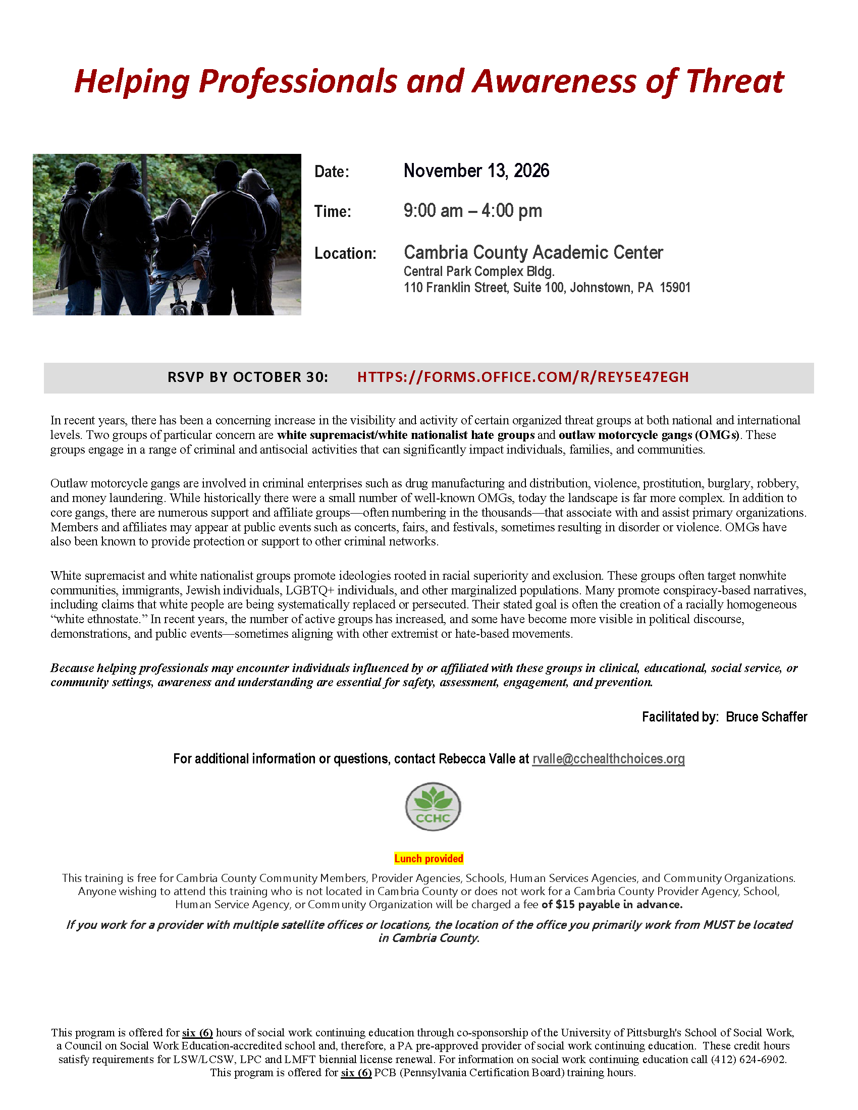 This training is free for Cambria County Community Members, Provider Agencies, Schools, Human Services Agencies, and Community Organizations. Anyone wishing to attend this training who is not located in Cambria County or does not work for a Cambria County Provider Agency, School, Human Service Agency, or Community Organization will be charged a fee of $15 payable in advance.