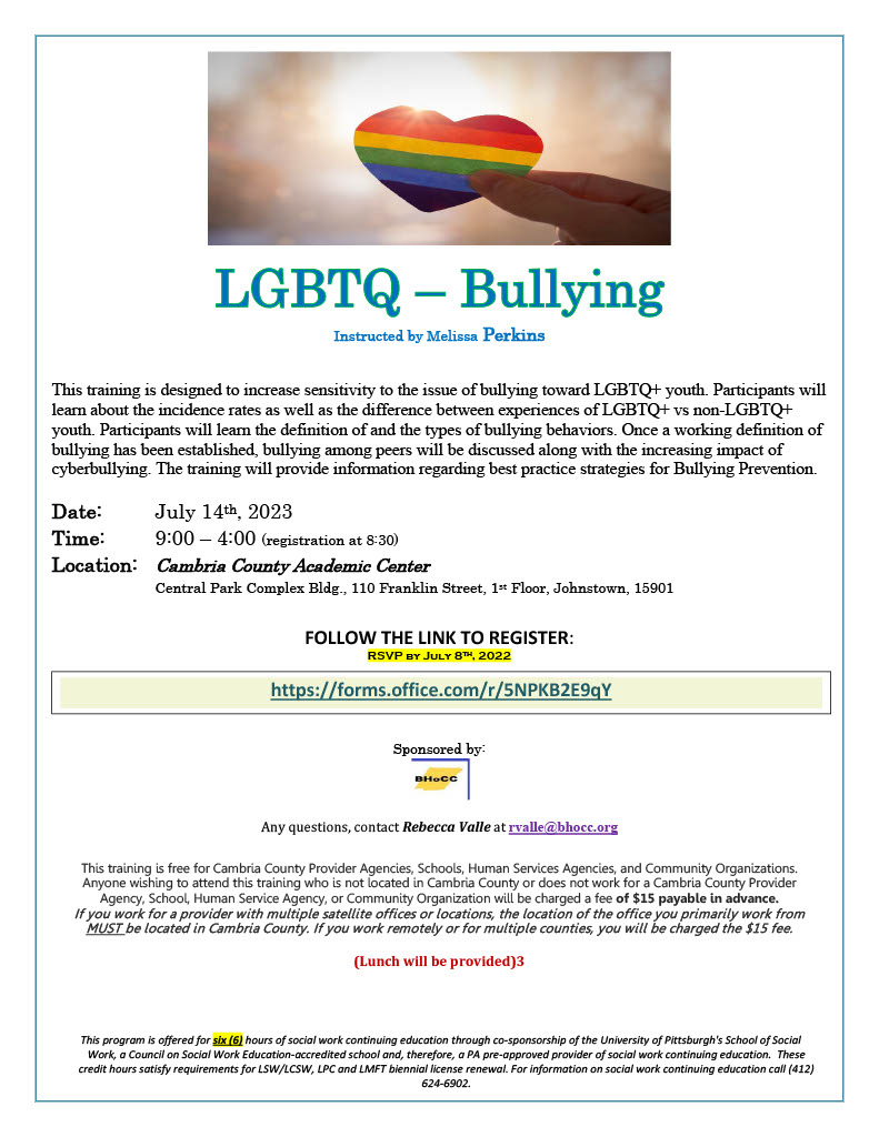 This training is free for Cambria County Provider Agencies, Schools, Human Services Agencies, and Community Organizations. Anyone wishing to attend this training who is not located in Cambria County or does not work for a Cambria County Provider Agency, School, Human Service Agency, or Community Organization will be charged a fee of $15 payable in advance.