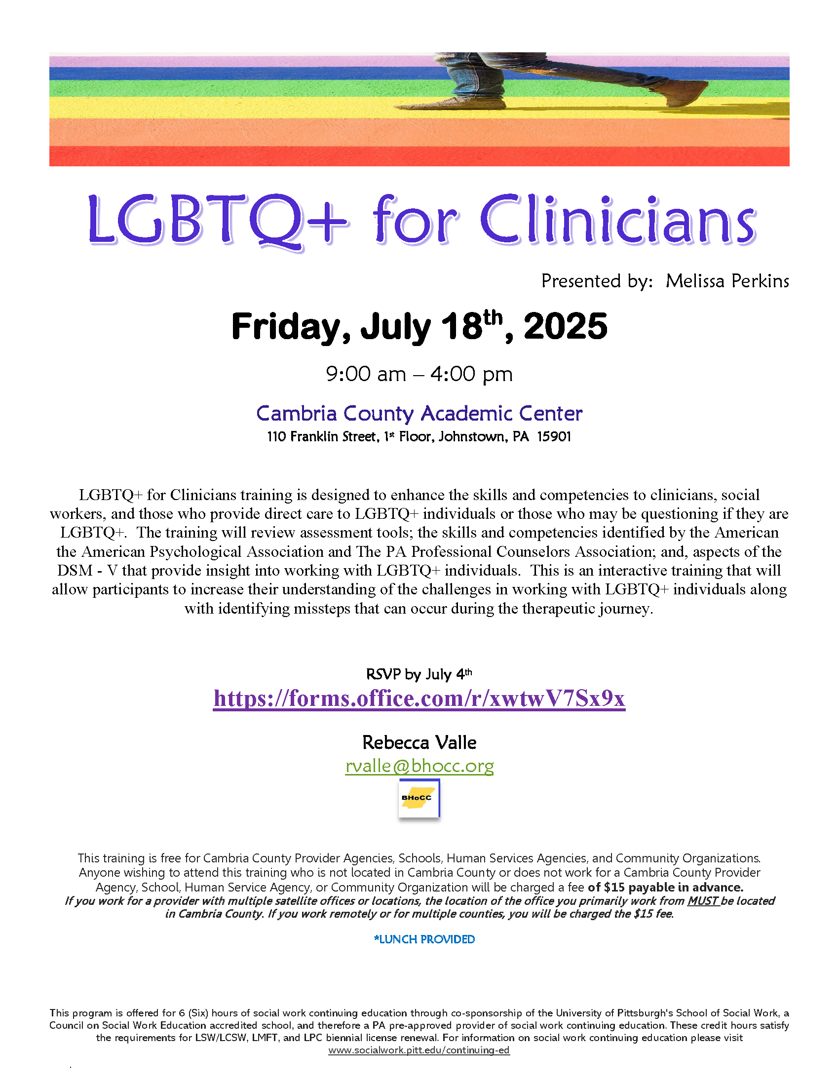 This training is free for Cambria County Provider Agencies, Schools, Human Services Agencies, and Community Organizations. Anyone wishing to attend this training who is not located in Cambria County or does not work for a Cambria County Provider Agency, School, Human Service Agency, or Community Organization will be charged a fee of $15 payable in advance.