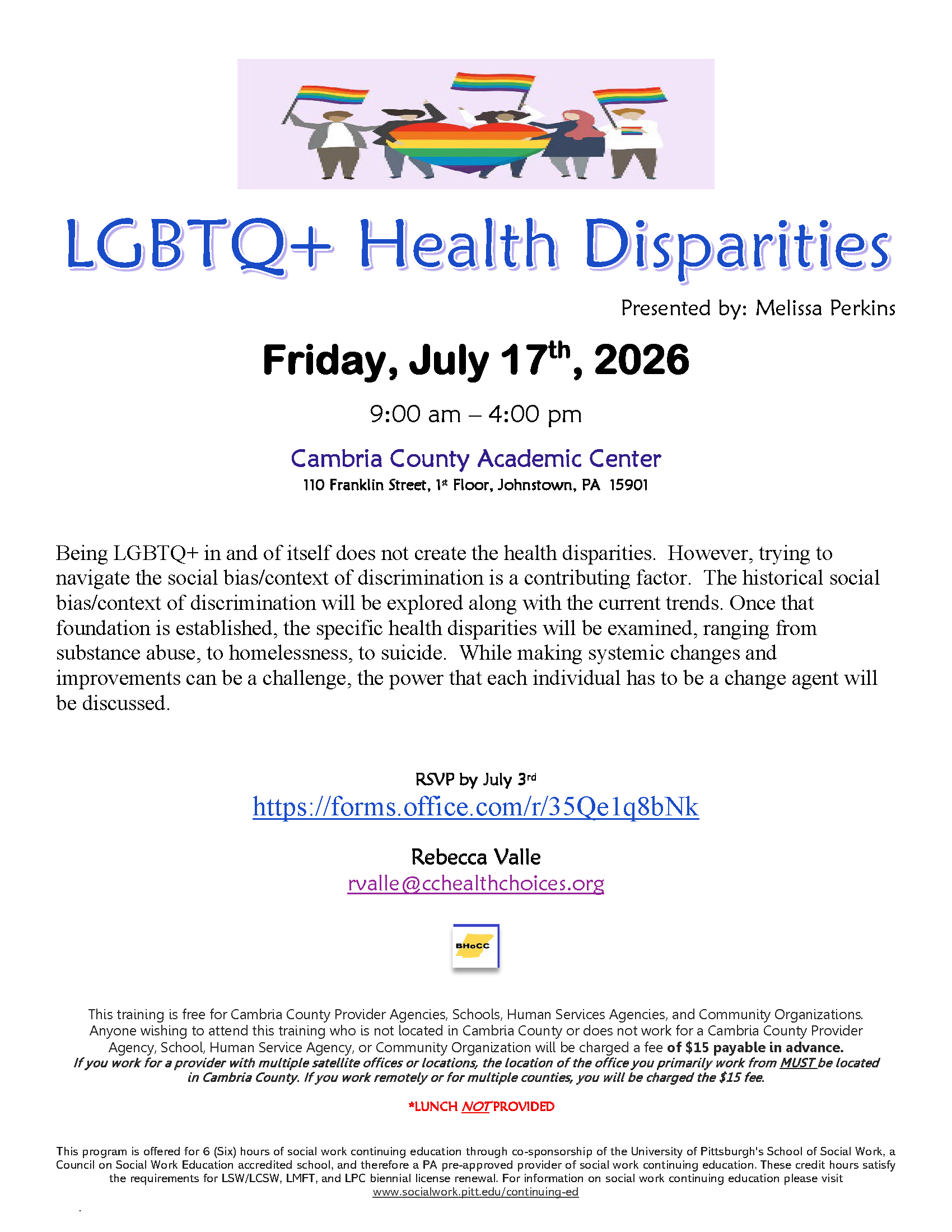 Registration link:  LGBTQ+ Health Disparities July 17, 2026 9:00-4:00 – Fill out form