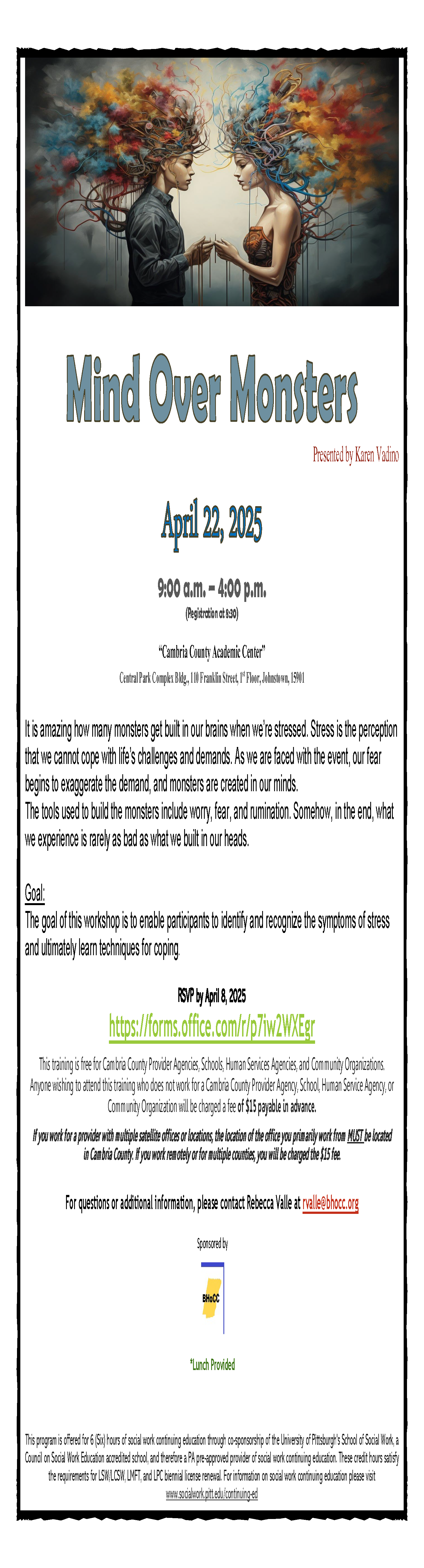 This training is free for Cambria County Provider Agencies, Schools, Human Services Agencies, and Community Organizations. Anyone wishing to attend this training who does not work for a Cambria County Provider Agency, School, Human Service Agency, or Community Organization will be charged a fee of $15 payable in advance.