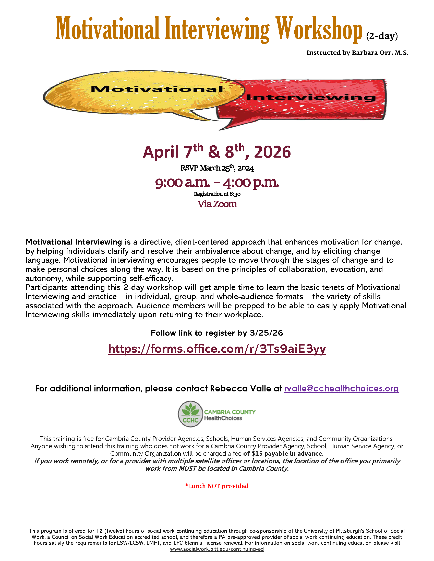 Register here:   Motivational Interviewing 2-Day Workshop April 7th & 8th, 2026 9:00-4:00  – Fill out form