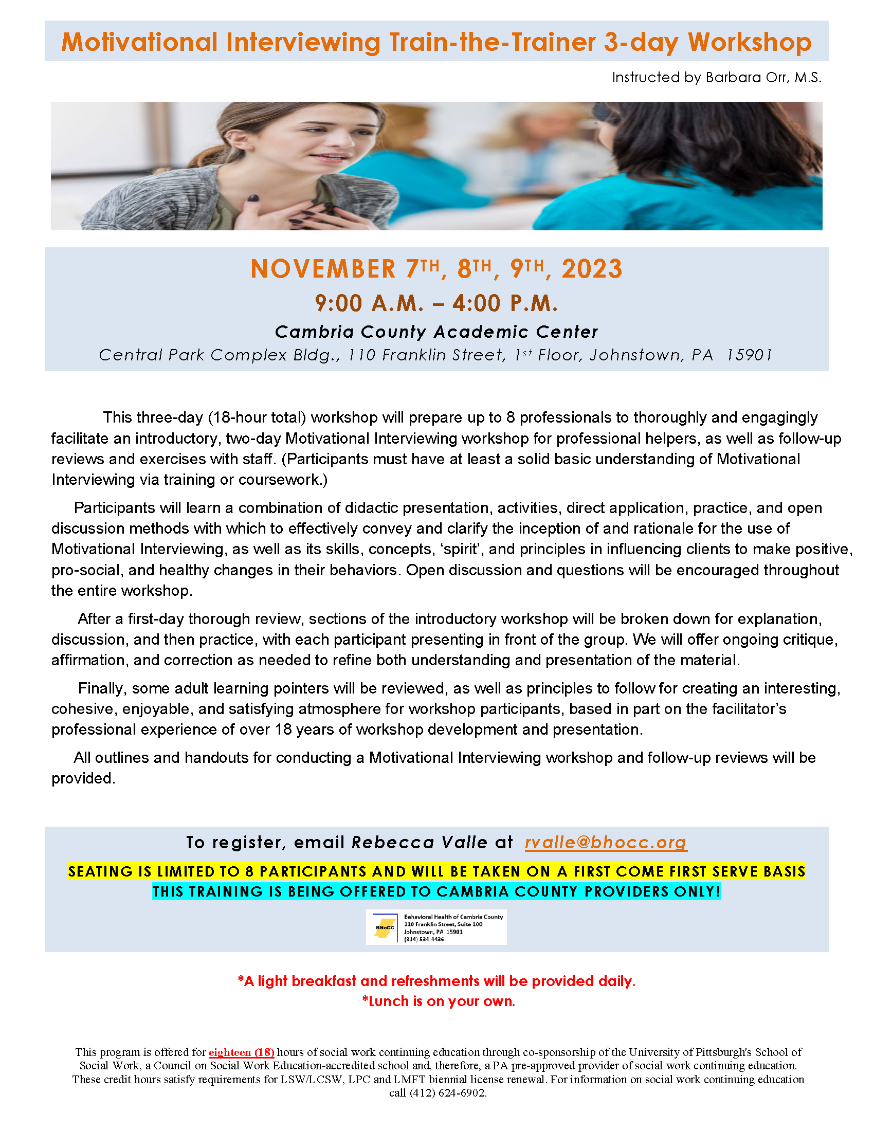 This training is being offered to Cambra County providers only. Contact Rebecca Valle at rvalle@bhocc.org to register. (seating is limited to 8 participants)