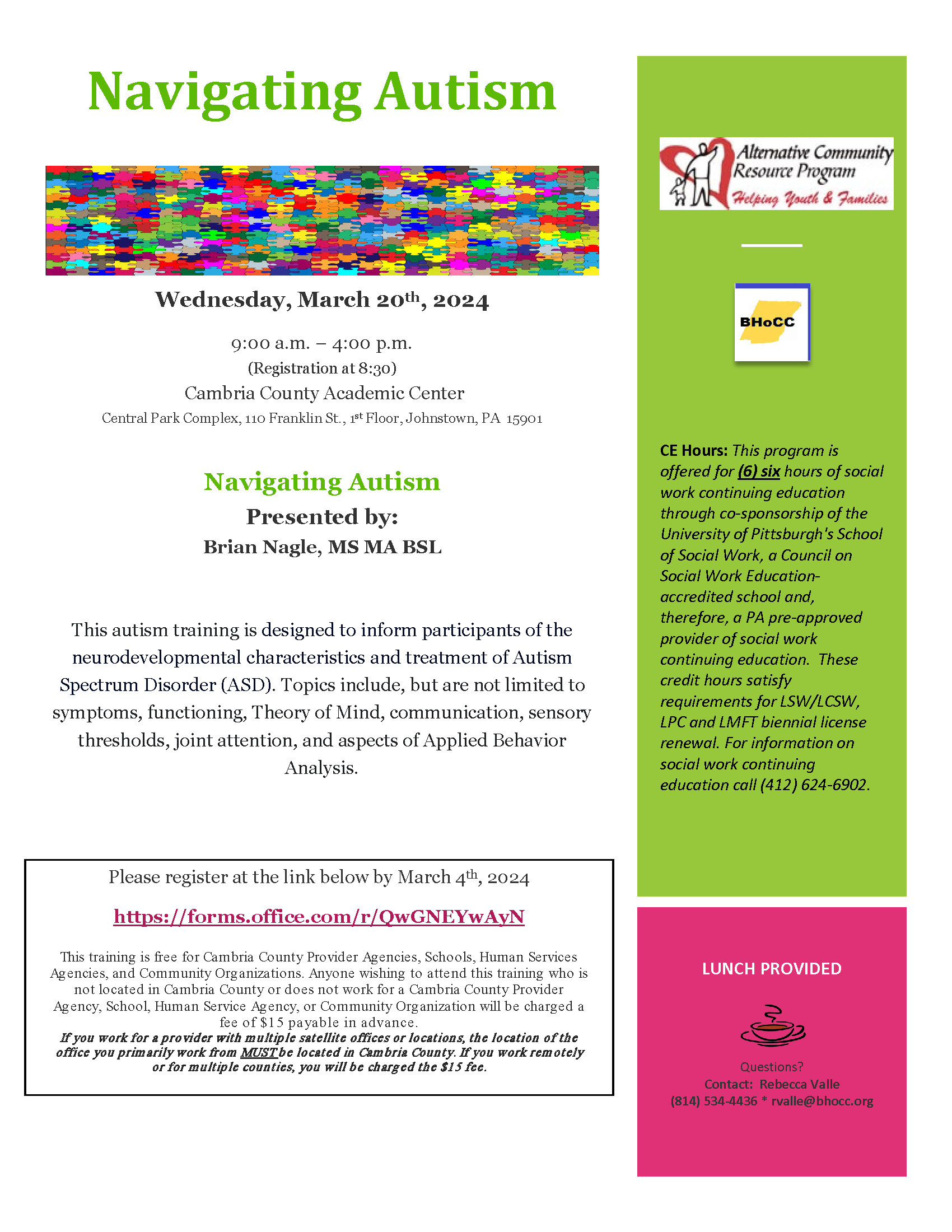 This training is free for Cambria County Provider Agencies, Schools, Human Services Agencies, and Community Organizations. Anyone wishing to attend this training who is not located in Cambria County or does not work for a Cambria County Provider Agency, School, Human Service Agency, or Community Organization will be charged a fee of $15 payable in advance.