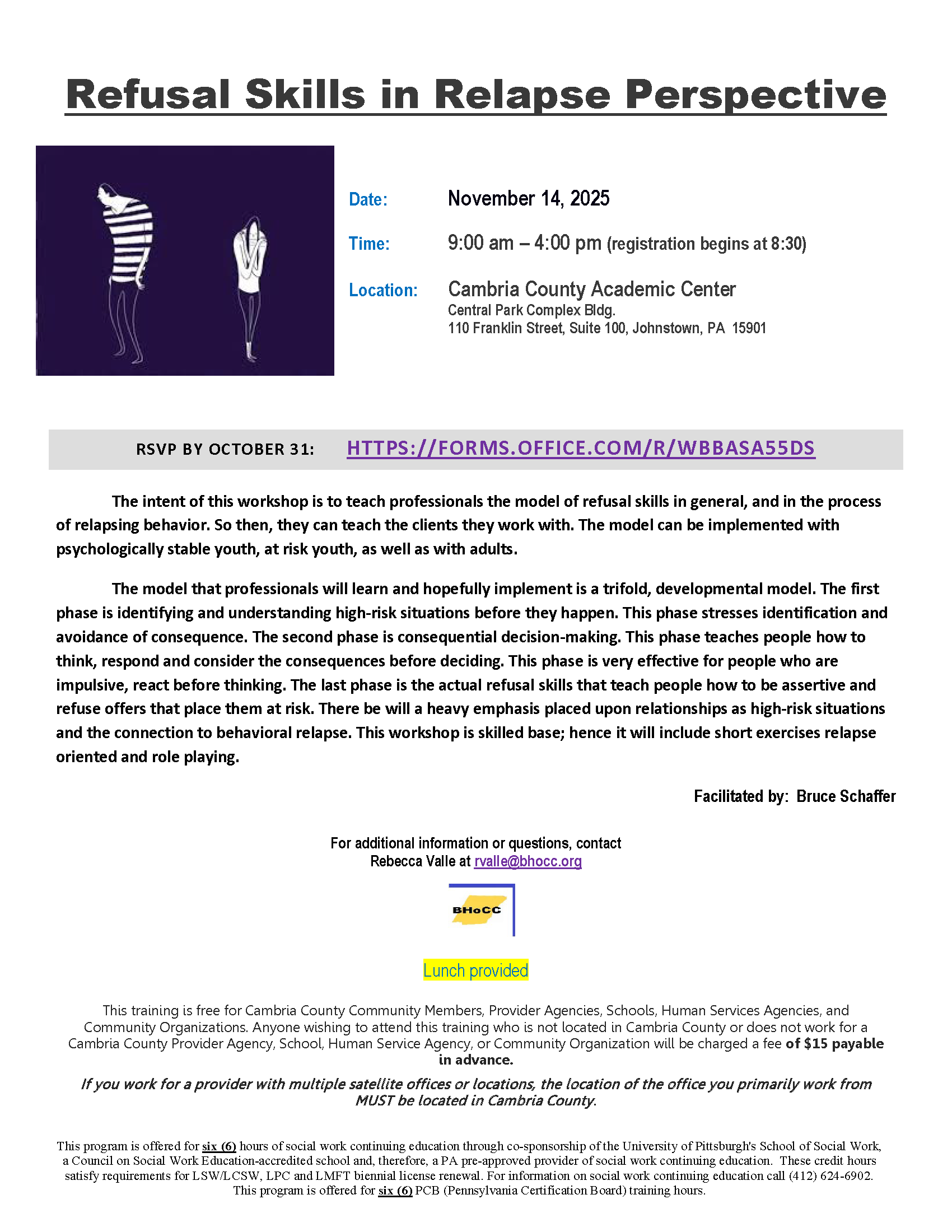 This training is free for Cambria County Community Members, Provider Agencies, Schools, Human Services Agencies, and Community Organizations. Anyone wishing to attend this training who is not located in Cambria County or does not work for a Cambria County Provider Agency, School, Human Service Agency, or Community Organization will be charged a fee of $15 payable in advance.