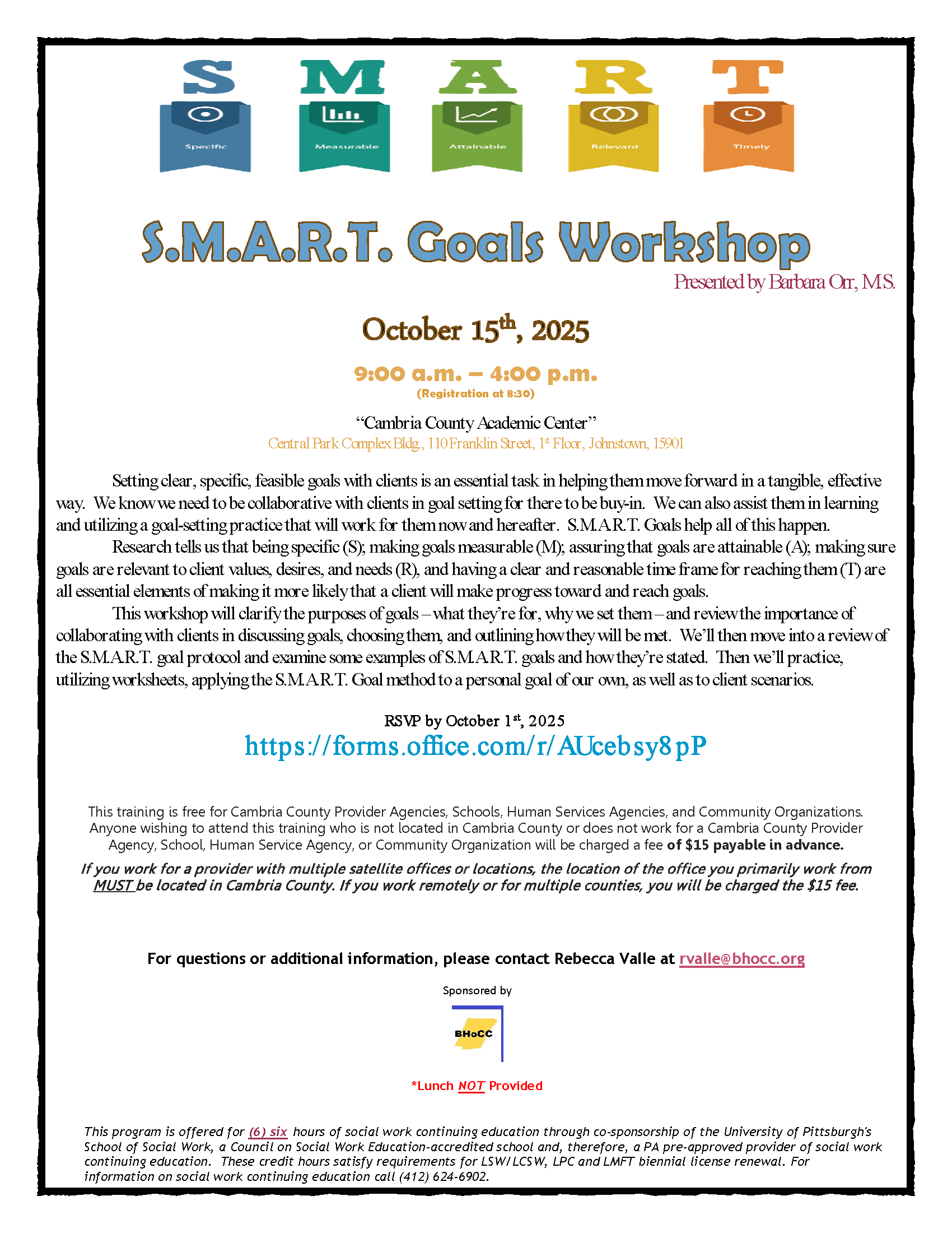 This training is free for Cambria County Provider Agencies, Schools, Human Services Agencies, and Community Organizations. Anyone wishing to attend this training who is not located in Cambria County or does not work for a Cambria County Provider Agency, School, Human Service Agency, or Community Organization will be charged a fee of $15 payable in advance.