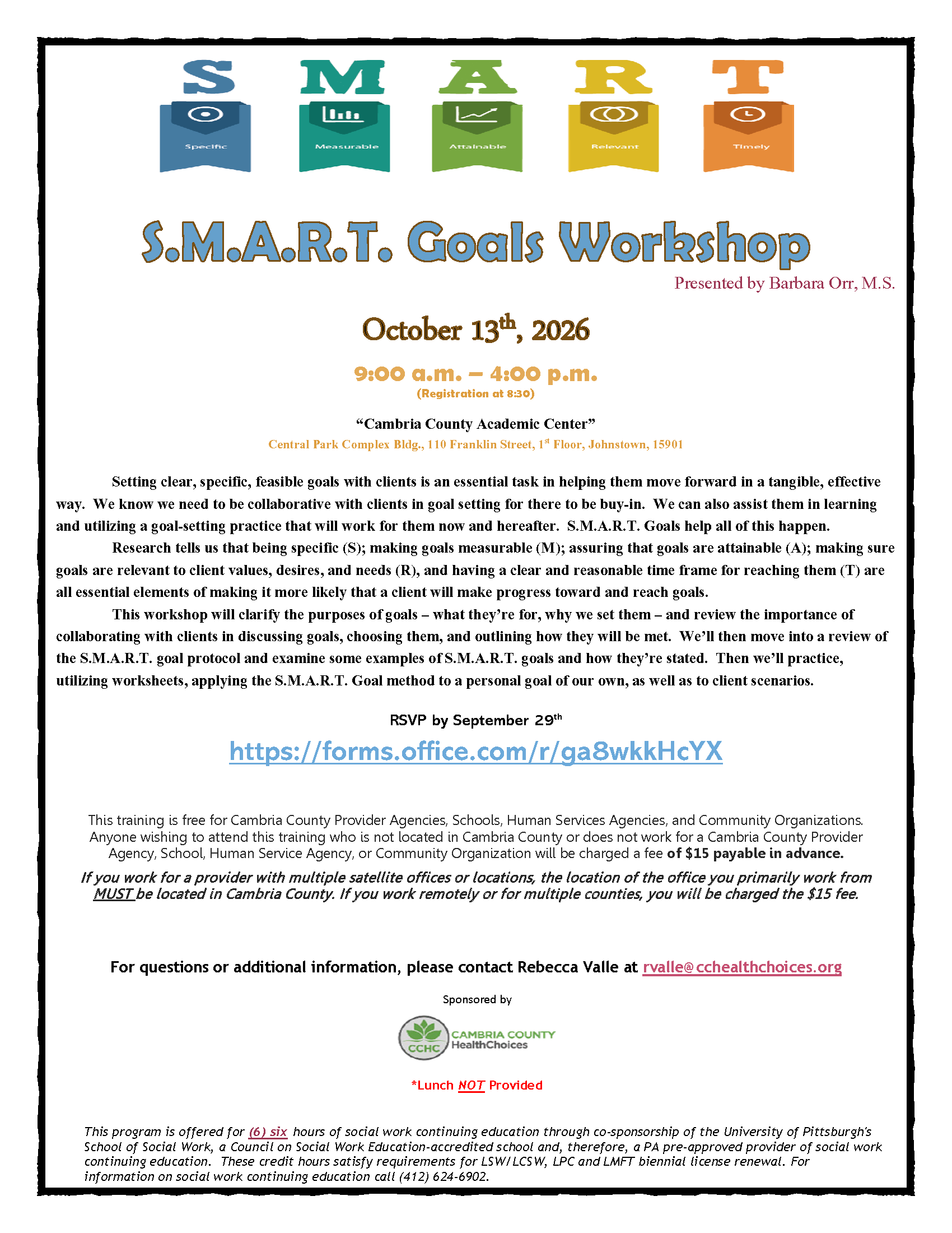 Please register to attend: S.M.A.R.T. Goals 10/13/26 9:00 – 4:00 – Fill out form