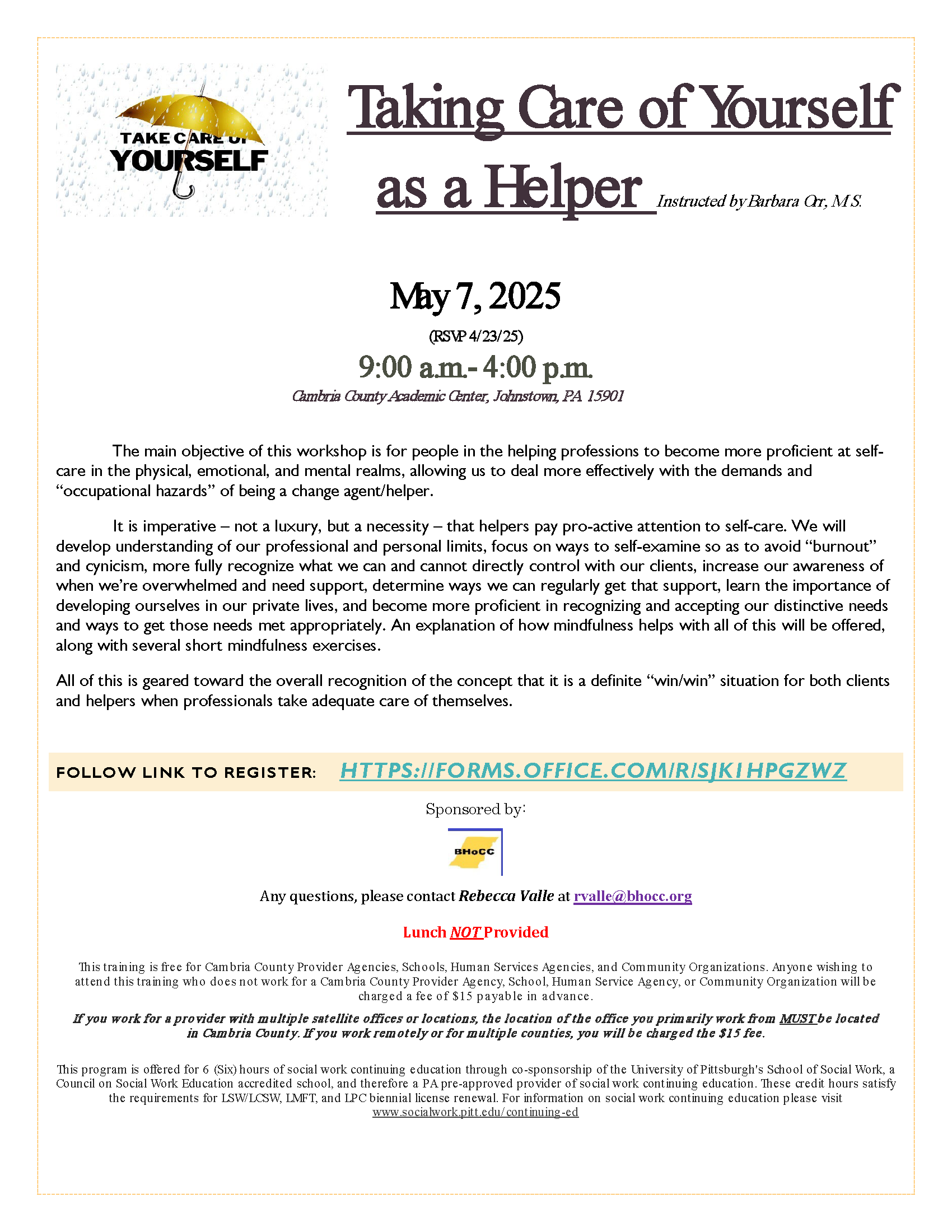 This training is free for Cambria County Provider Agencies, Schools, Human Services Agencies, and Community Organizations. Anyone wishing to attend this training who does not work for a Cambria County Provider Agency, School, Human Service Agency, or Community Organization will be charged a fee of $15 payable in advance.