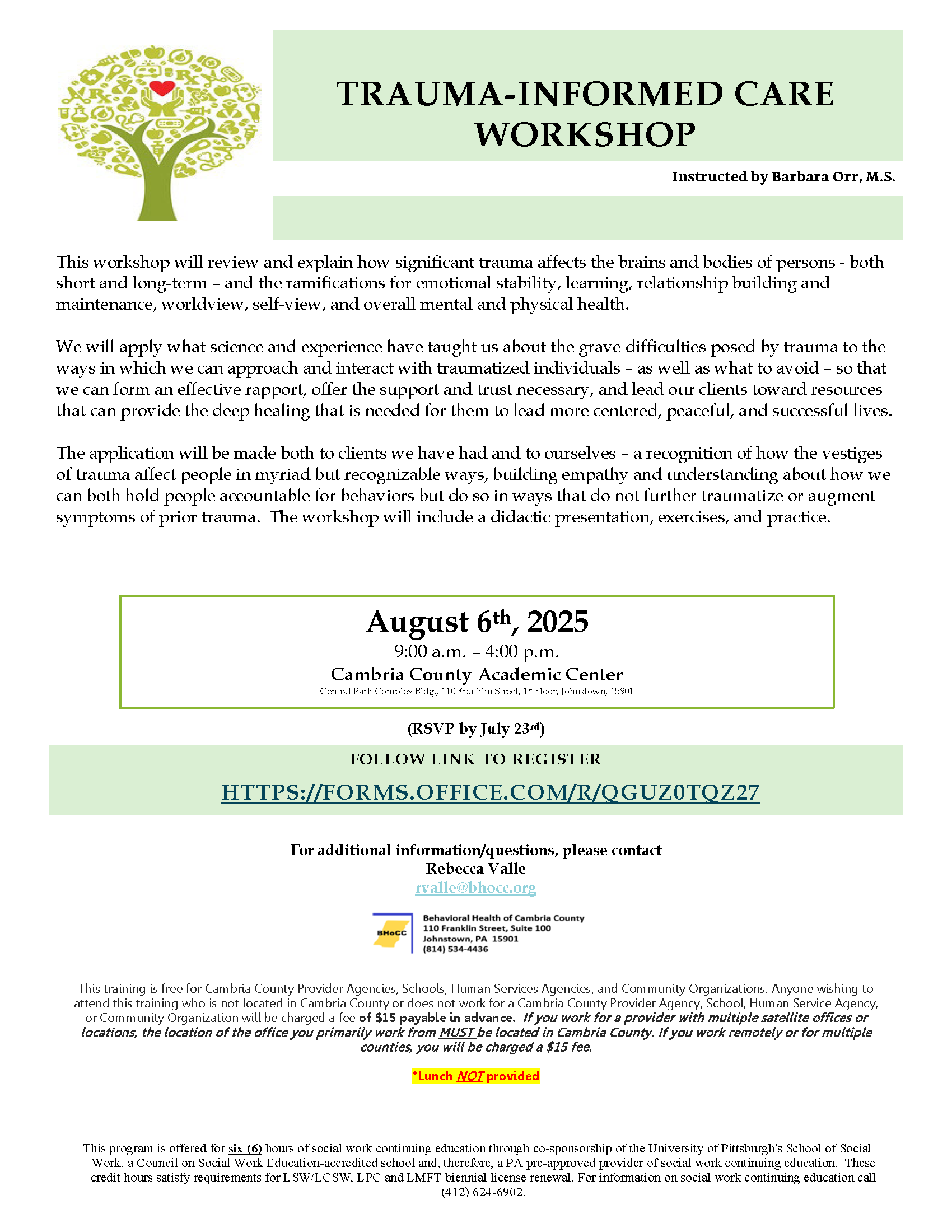 This training is free for Cambria County Provider Agencies, Schools, Human Services Agencies, and Community Organizations. Anyone wishing to attend this training who is not located in Cambria County or does not work for a Cambria County Provider Agency, School, Human Service Agency, or Community Organization will be charged a fee of $15 payable in advance. If you work for a provider with multiple satellite offices or locations, the location of the office you primarily work from MUST be located in Cambria County. If you work remotely or for multiple counties, you will be charged a $15 fee.