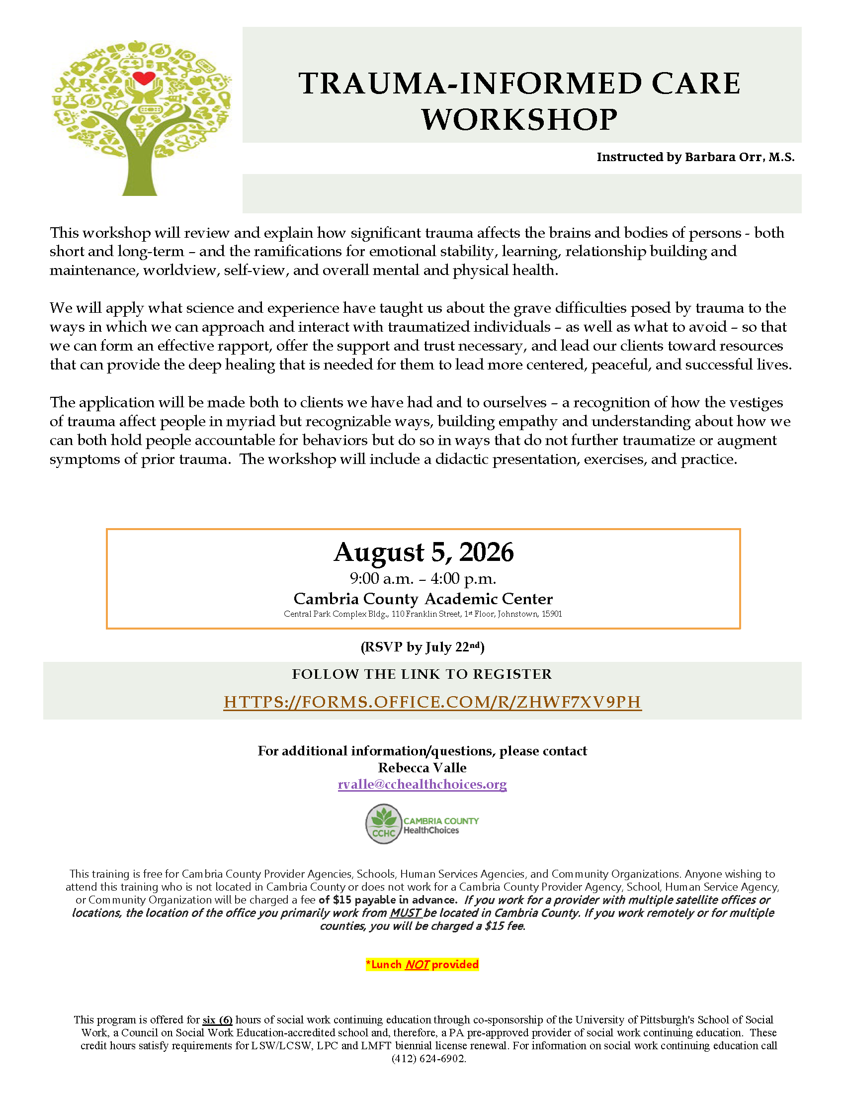 Registration link:  Trauma-Informed Care August 5, 2026 9:00-4:00   – Fill out form