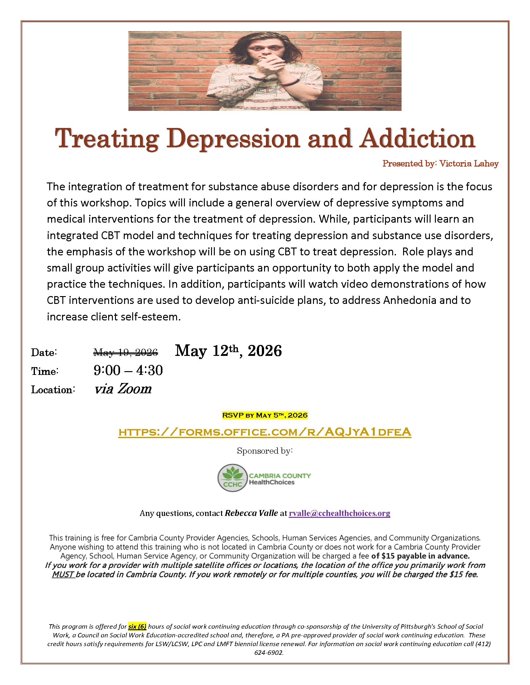 This training is free for Cambria County Provider Agencies, Schools, Human Services Agencies, and Community Organizations. Anyone wishing to attend this training who is not located in Cambria County or does not work for a Cambria County Provider Agency, School, Human Service Agency, or Community Organization will be charged a fee of $15 payable in advance.