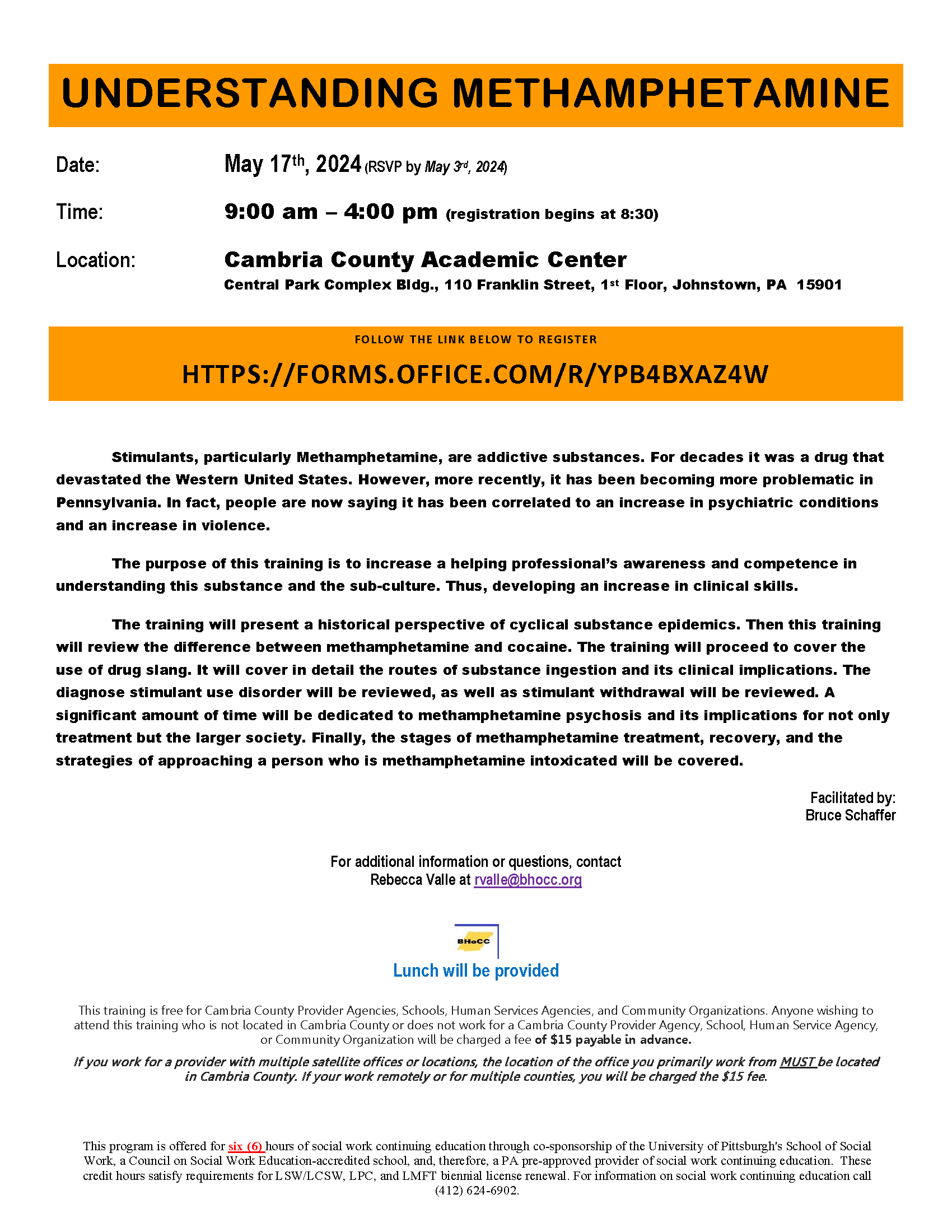 This training is free for Cambria County Provider Agencies, Schools, Human Services Agencies, and Community Organizations. Anyone wishing to attend this training who is not located in Cambria County or does not work for a Cambria County Provider Agency, School, Human Service Agency, or Community Organization will be charged a fee of $15 payable in advance.