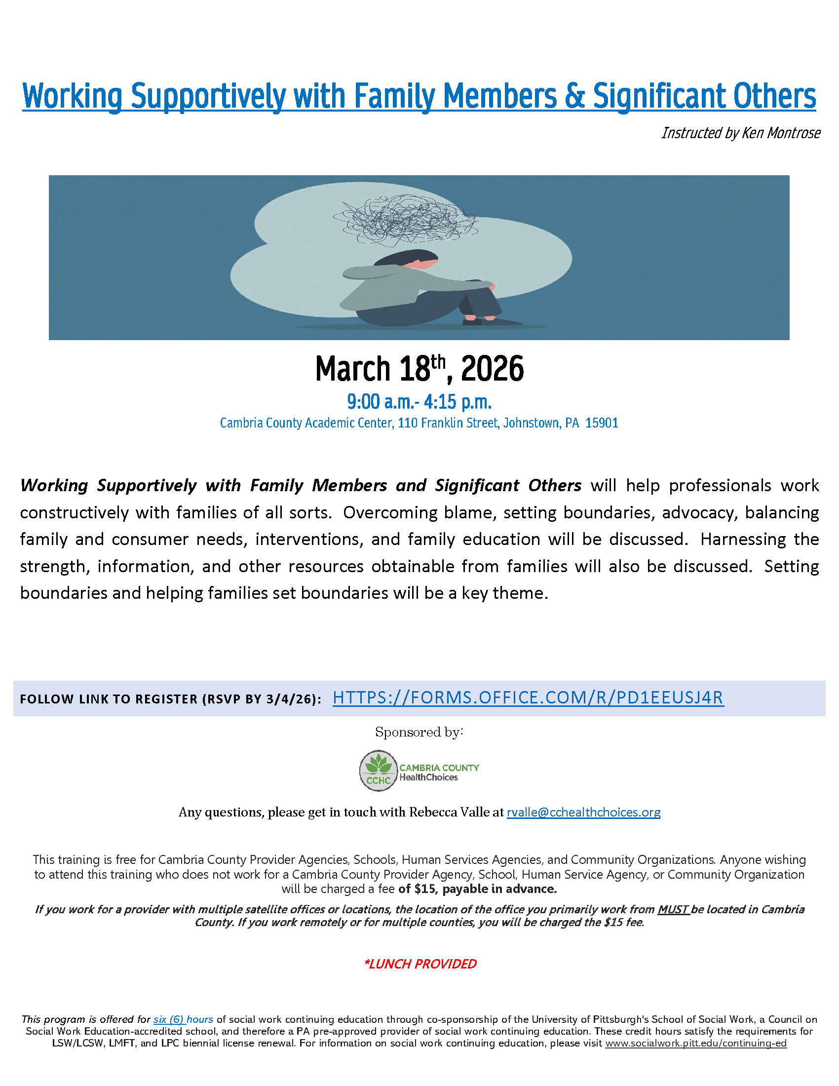 This training is free for Cambria County Provider Agencies, Schools, Human Services Agencies, and Community Organizations. Anyone wishing to attend this training who does not work for a Cambria County Provider Agency, School, Human Service Agency, or Community Organization will be charged a fee of $15, payable in advance.
